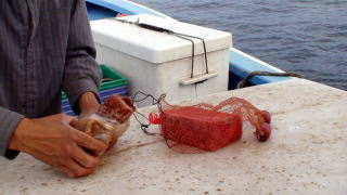 海の上層と下層では潮の流れが逆になることもありますので、漁師の経験と感が大切となります。かご網の中には、えさを入れます。えさは凍ったオキアミのかたまりです。