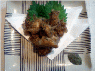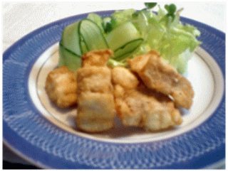 軽く塩コショウをして、小麦粉をまぶして揚げて見ました。ほわっとした白身魚のフライという感じです。それだけでは面白くないので、ソース(タルタルソース・トマトソースなどなど)を添えるといいでしょう。南蛮漬けや中華あんかけなどのバリエーションもありそうです。