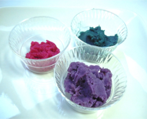 「紫イモには、アントシアニンという物質がたくさん含まれているの。紫色の成分ね。これにマヨネーズを入れたでしょ。マヨネーズには酸というすっぱい成分が入っていて、この酸とアントシアニンが混ざるとピンク色になるの。アントシアニンは目の健康にいいのよ。植物のこのような成分を『ポリフェノール』といって、紫イモのほかにもレッドキャベツやブルーベリー、いちご、りんごなどにも含まれているのよ」