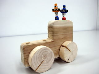 ある会場で、子どもがこの車に糸をつけてほしいと言いました。目的は直ぐにわかりました。子どもはその糸を持って、自動車を引っ張って遊んでいました。その姿をみていた他の子どもたちも、次から次へと同じ遊びを始めました。何台かの車を繋いてみたり、紙で自動車に飾りを付けてみたりと、遊びはどんどん広がって行くのですが、おやじのお手伝いはここまでです。