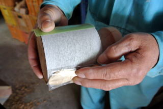 最後は、もうやけくそだったようです。いろいろな工夫をしてみても、思いどおりの靴べらはできませんでした。あきらめかけていた頃、ホームセンターでふと目に入ったのが家具と床の間に敷く緩衝材でした。材質は、ゴムに似た堅めのスポンジのようなもので、厚さは5mm。これにサンドペーパーを巻き付けることで、ようやく満足できるやぶちゃん流の治具が完成したのです。